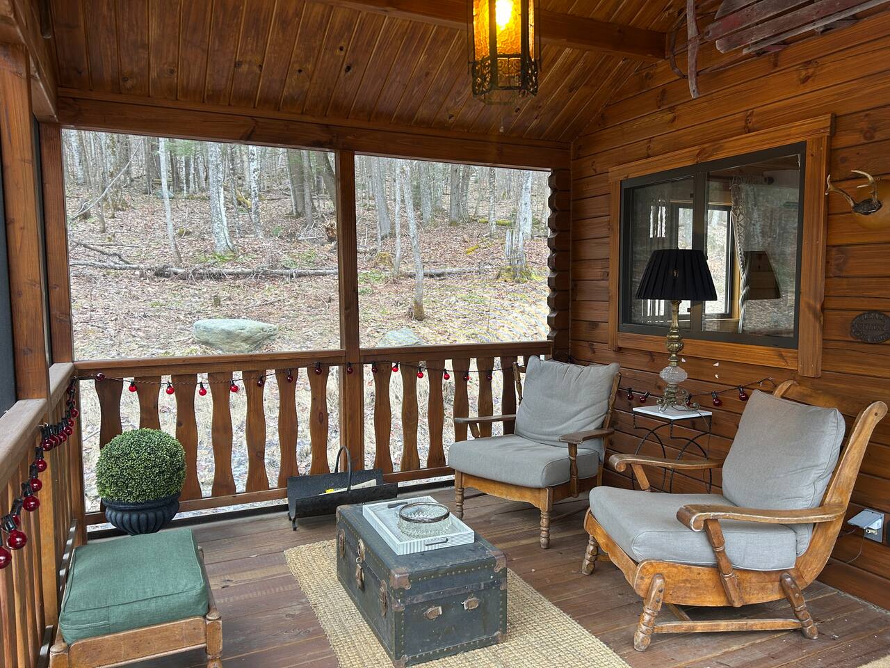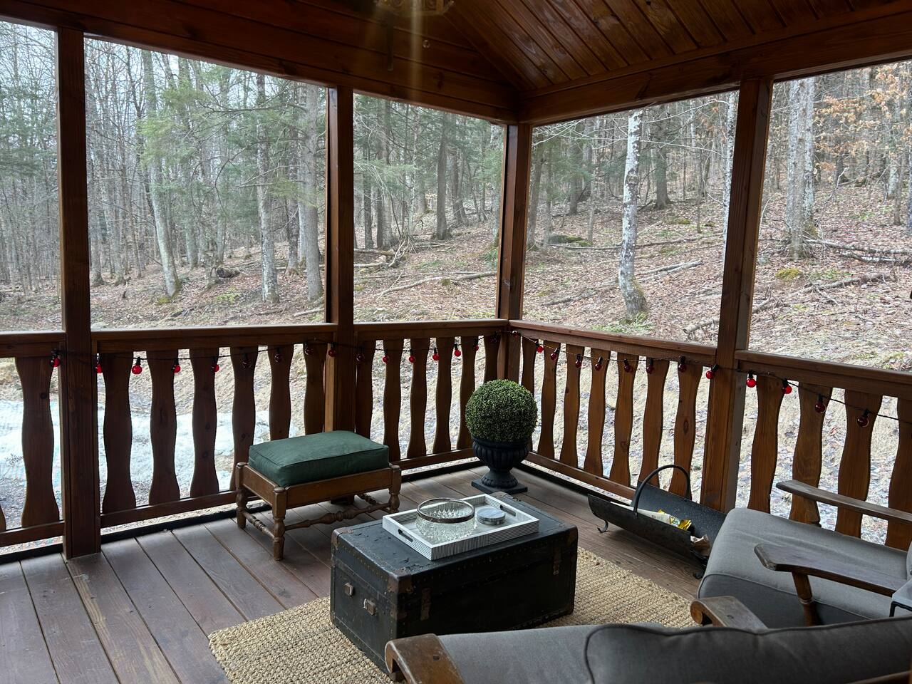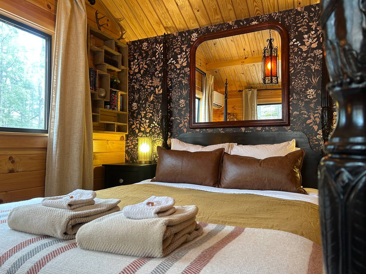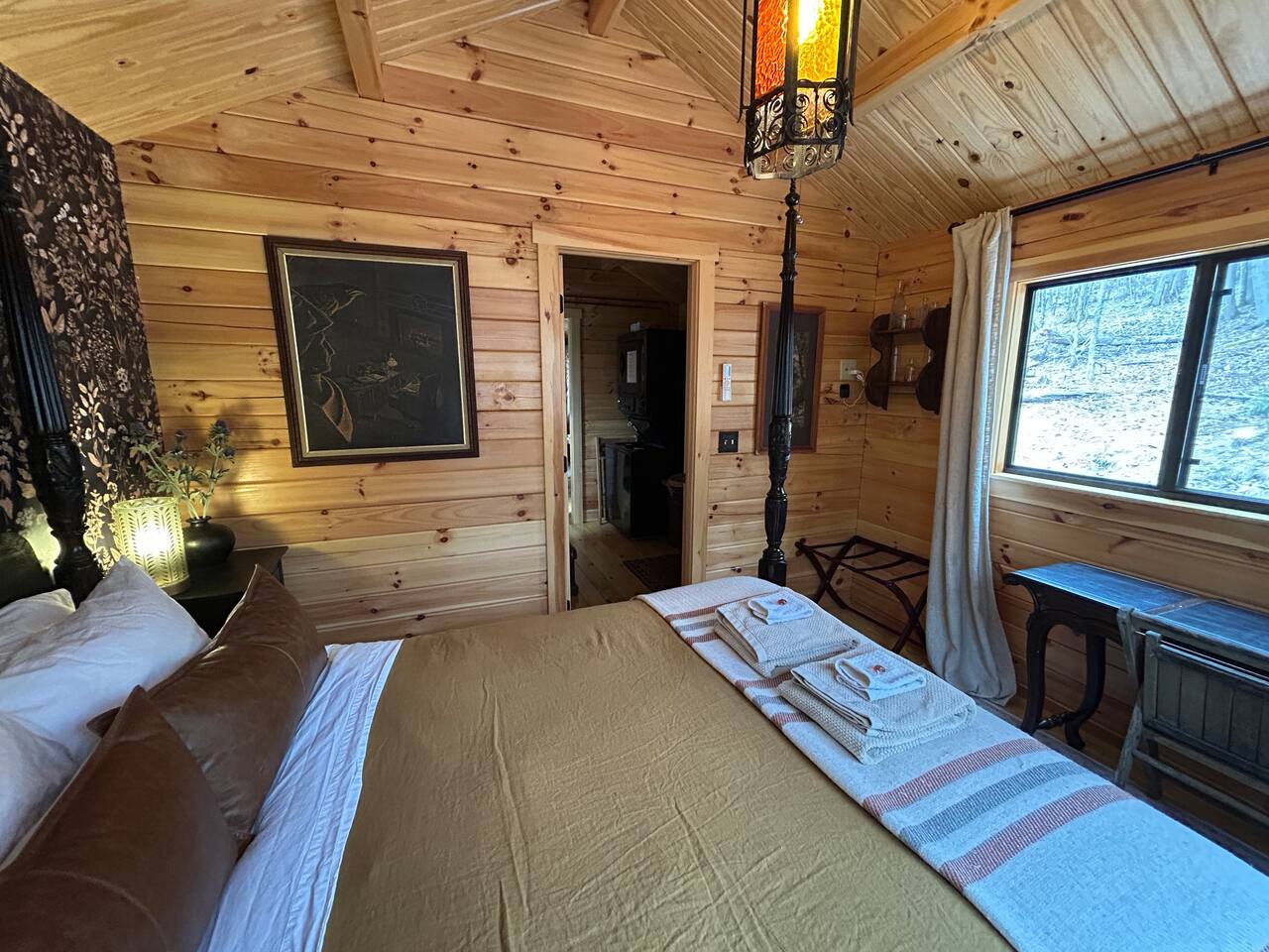 Inside this rustic log cabin, every detail has been considered. The living area centers on a tufted leather loveseat beneath a gothic candelabra chandelier, with dark-stained log walls creating a warm, moody contrast against the pine ceiling. Macramé curtains, an antique wooden dresser, ornate ironwork accents, and a vintage trunk used as a coffee table give the space a layered, old-world character. The bedroom is built around a tall carved four-poster bed in dark ebony, set against deep navy botanical wallpaper with warm amber lamps on either side. An ornate antique writing desk with a gilded mirror sits at the window, and a curated shelf of vintage apothecary vessels lines the wall — thoughtful details that make this feel unlike a typical cabin bedroom. The screened front porch runs the width of the cabin and looks directly into the forest. Vintage wooden armchairs, an antique steamer trunk, and string lights make it a natural spot for morning coffee, evening wine, or simply listening to rain in the trees. The full kitchen features hickory cabinetry, black appliances, and dark countertops — fully stocked with everything you'll need. A dining area seats two. The living room has a Roku TV with guest mode for your streaming accounts. High speed Wi-Fi throughout. Heat and A/C are handled by two mini-split systems. A stacked washer and dryer, iron, and hair dryer are available. We provide 100% cotton sheets, full towels, and all bathroom and kitchen essentials. A drip coffee maker with complimentary coffee, tea, creamers, and sugar is ready and waiting. A fire pit is steps away — firestarters and a lighter provided, firewood available locally.