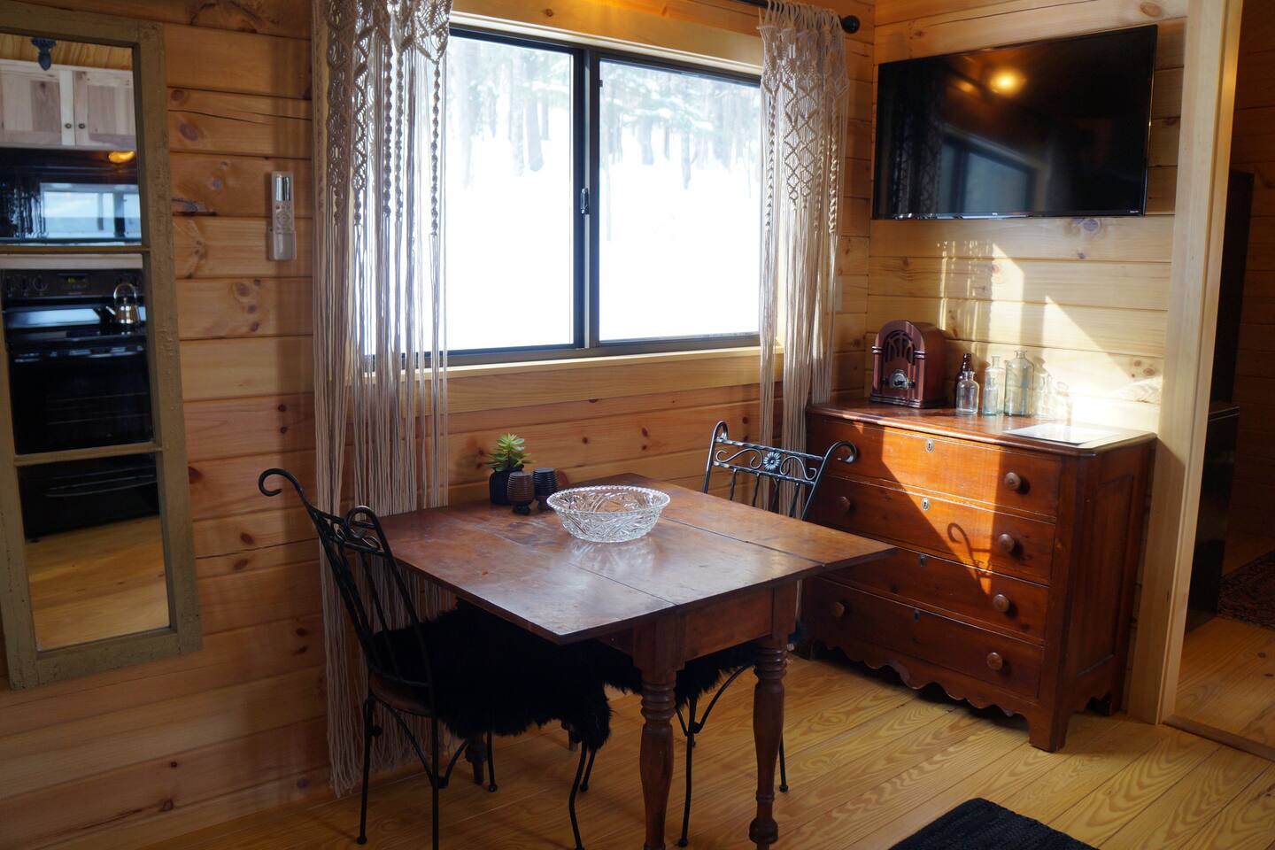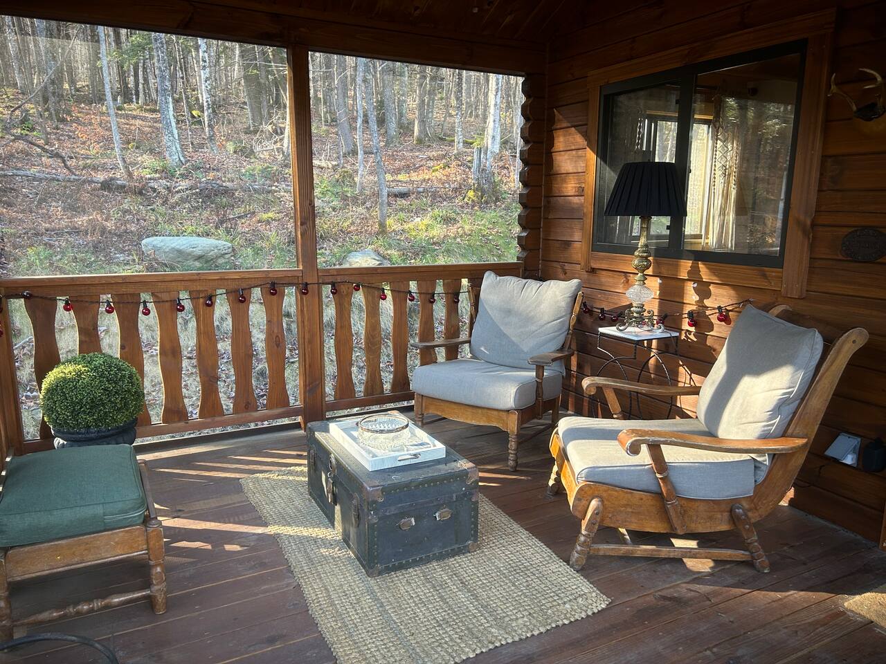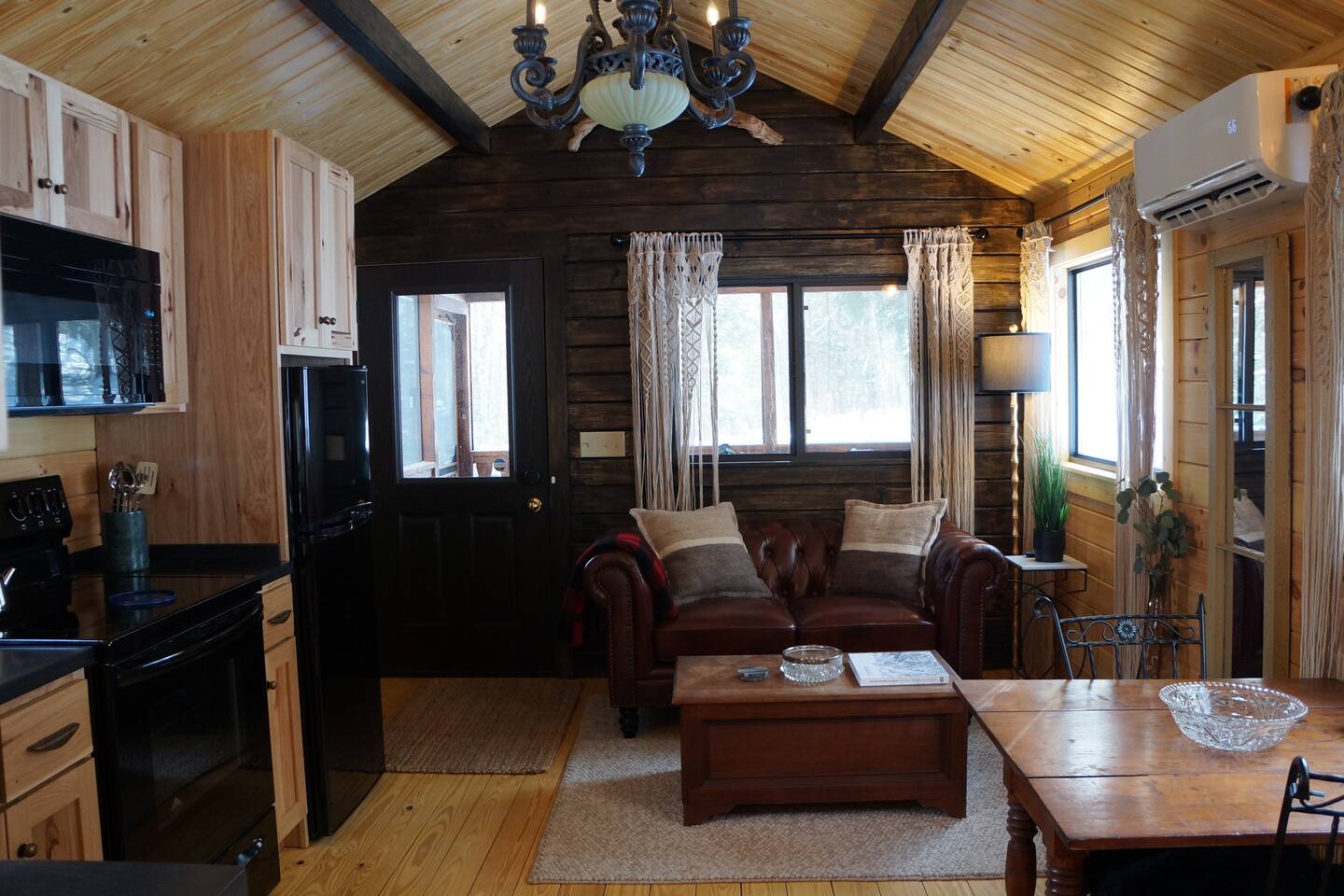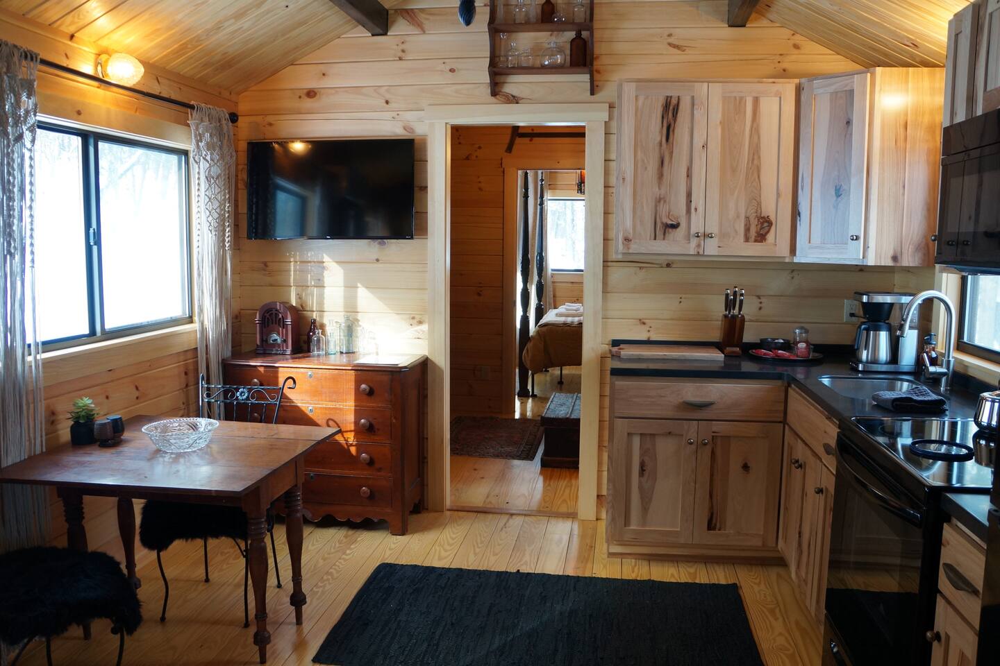 Inside this rustic log cabin, every detail has been considered. The living area centers on a tufted leather loveseat beneath a gothic candelabra chandelier, with dark-stained log walls creating a warm, moody contrast against the pine ceiling. Macramé curtains, an antique wooden dresser, ornate ironwork accents, and a vintage trunk used as a coffee table give the space a layered, old-world character. The bedroom is built around a tall carved four-poster bed in dark ebony, set against deep navy botanical wallpaper with warm amber lamps on either side. An ornate antique writing desk with a gilded mirror sits at the window, and a curated shelf of vintage apothecary vessels lines the wall — thoughtful details that make this feel unlike a typical cabin bedroom. The screened front porch runs the width of the cabin and looks directly into the forest. Vintage wooden armchairs, an antique steamer trunk, and string lights make it a natural spot for morning coffee, evening wine, or simply listening to rain in the trees. The full kitchen features hickory cabinetry, black appliances, and dark countertops — fully stocked with everything you'll need. A dining area seats two. The living room has a Roku TV with guest mode for your streaming accounts. High speed Wi-Fi throughout. Heat and A/C are handled by two mini-split systems. A stacked washer and dryer, iron, and hair dryer are available. We provide 100% cotton sheets, full towels, and all bathroom and kitchen essentials. A drip coffee maker with complimentary coffee, tea, creamers, and sugar is ready and waiting. A fire pit is steps away — firestarters and a lighter provided, firewood available locally.