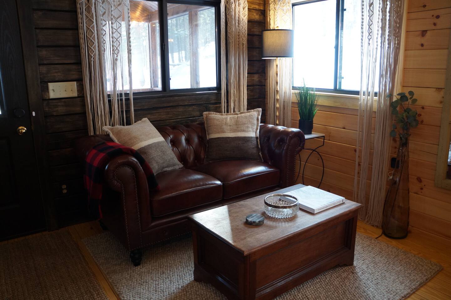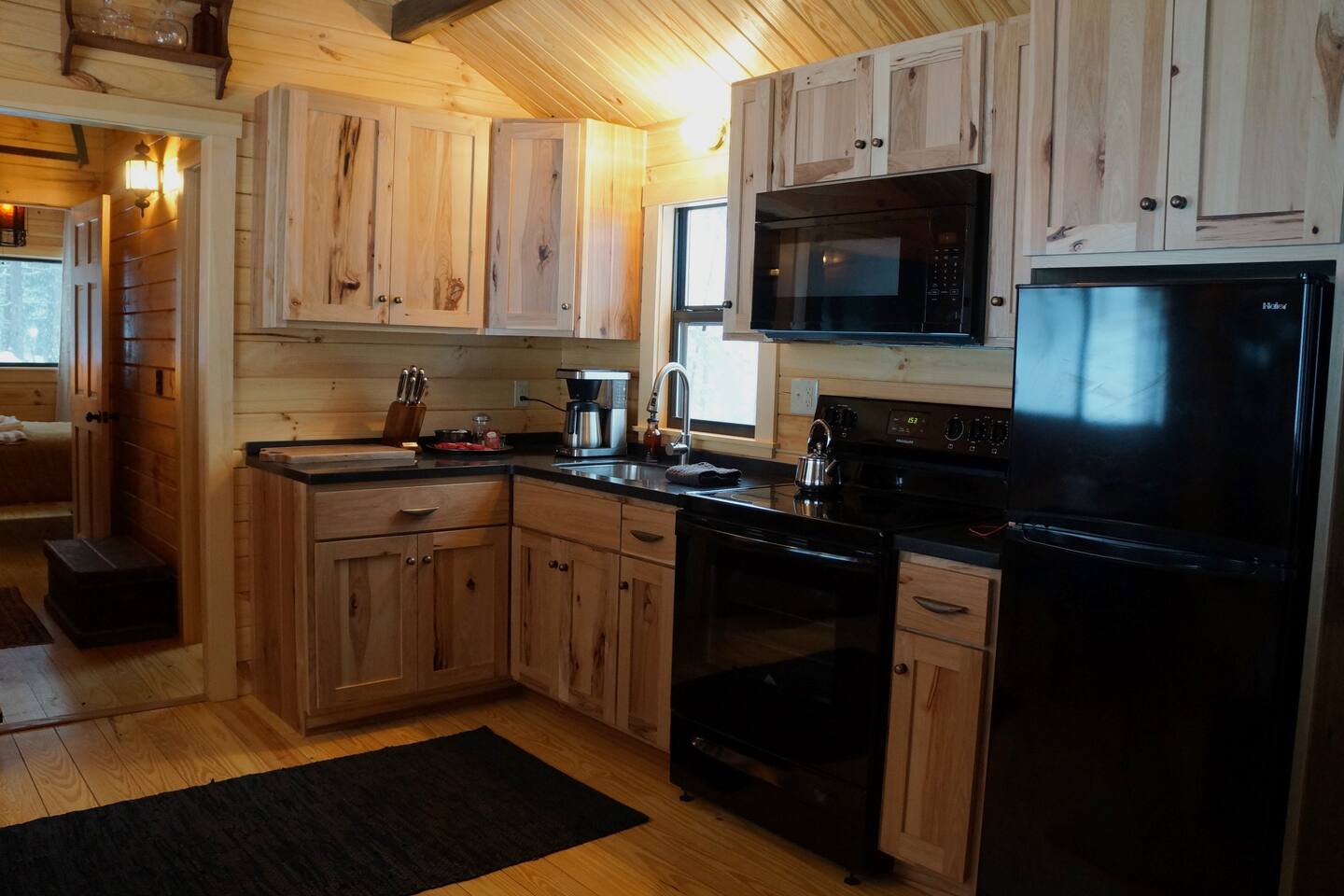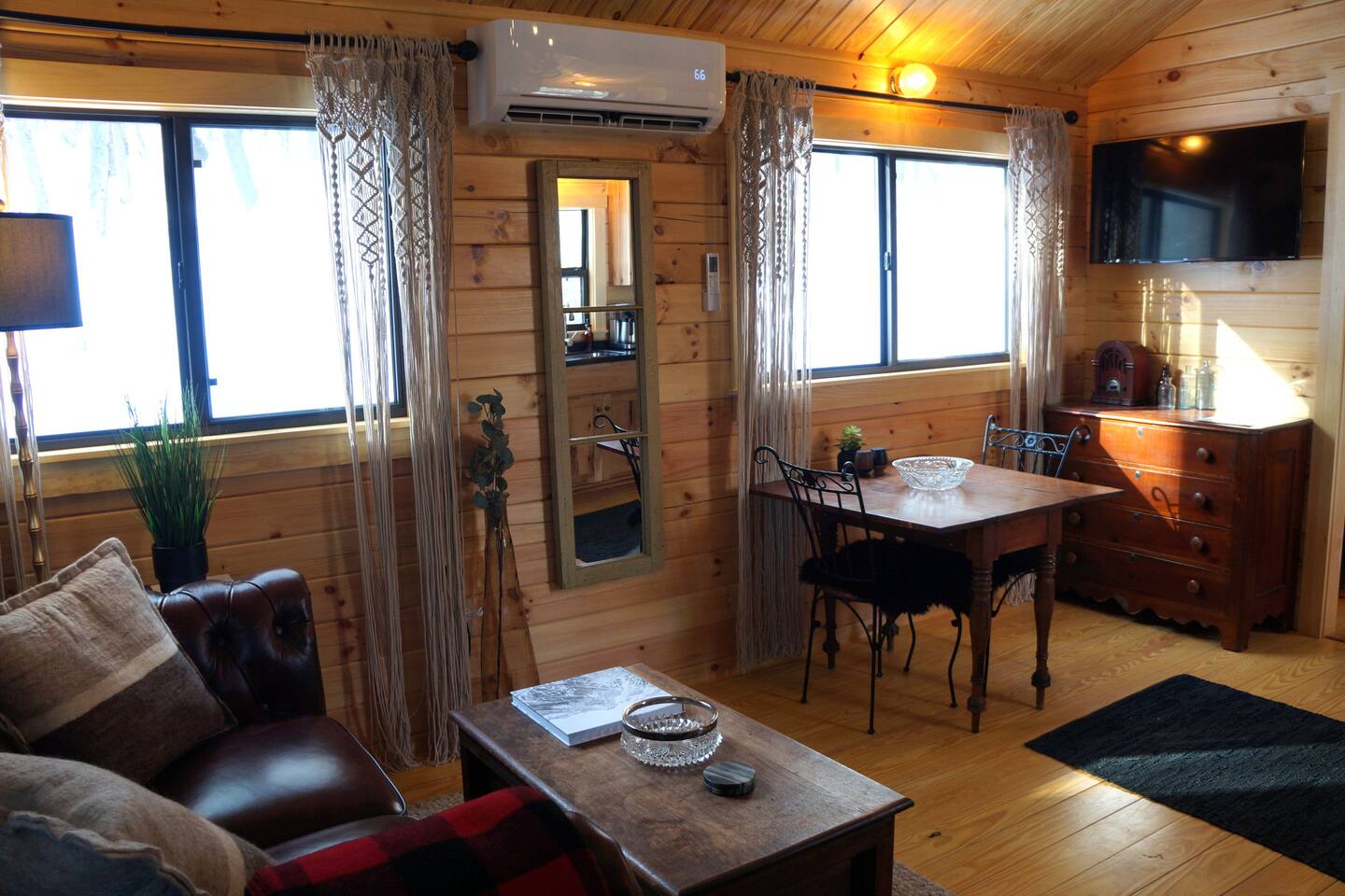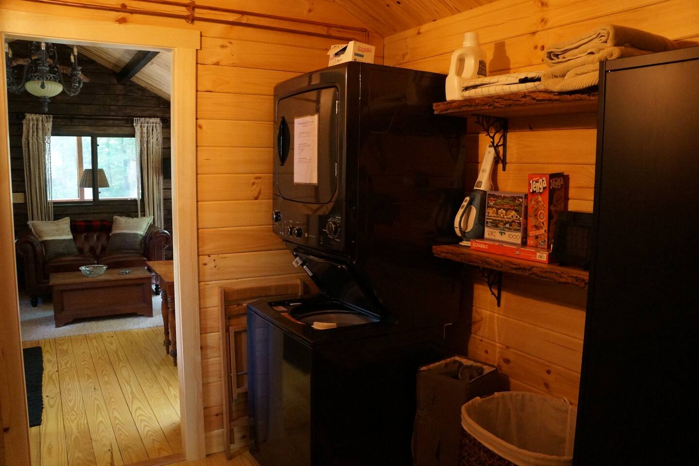 Inside this rustic log cabin, every detail has been considered. The living area centers on a tufted leather loveseat beneath a gothic candelabra chandelier, with dark-stained log walls creating a warm, moody contrast against the pine ceiling. Macramé curtains, an antique wooden dresser, ornate ironwork accents, and a vintage trunk used as a coffee table give the space a layered, old-world character. The bedroom is built around a tall carved four-poster bed in dark ebony, set against deep navy botanical wallpaper with warm amber lamps on either side. An ornate antique writing desk with a gilded mirror sits at the window, and a curated shelf of vintage apothecary vessels lines the wall — thoughtful details that make this feel unlike a typical cabin bedroom. The screened front porch runs the width of the cabin and looks directly into the forest. Vintage wooden armchairs, an antique steamer trunk, and string lights make it a natural spot for morning coffee, evening wine, or simply listening to rain in the trees. The full kitchen features hickory cabinetry, black appliances, and dark countertops — fully stocked with everything you'll need. A dining area seats two. The living room has a Roku TV with guest mode for your streaming accounts. High speed Wi-Fi throughout. Heat and A/C are handled by two mini-split systems. A stacked washer and dryer, iron, and hair dryer are available. We provide 100% cotton sheets, full towels, and all bathroom and kitchen essentials. A drip coffee maker with complimentary coffee, tea, creamers, and sugar is ready and waiting. A fire pit is steps away — firestarters and a lighter provided, firewood available locally.
