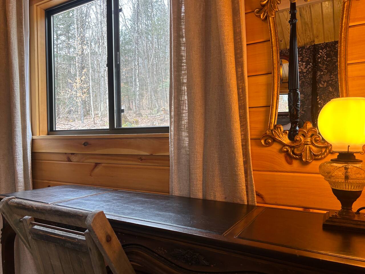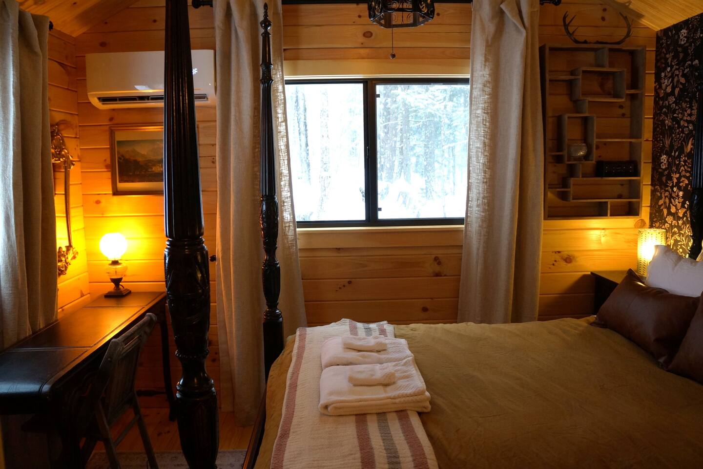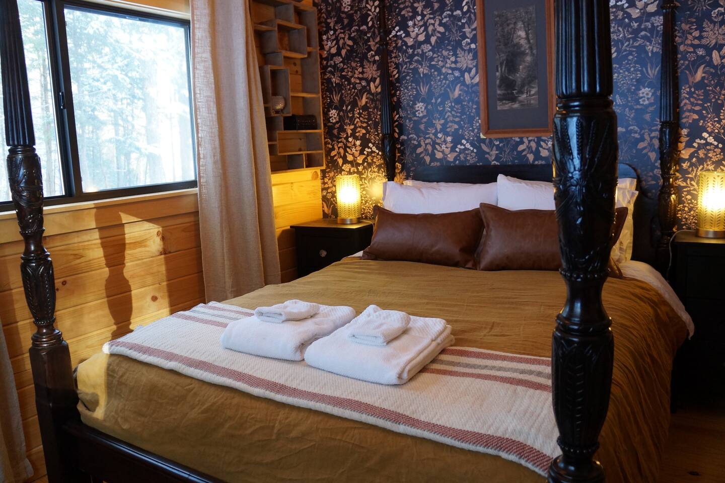 Step into a cabin steeped in old-world mystery — a two-guest retreat with a dark romantic soul, tucked at the end of a private drive deep in the Vermont woods. A carved four-poster bed, gothic chandelier, botanical wallpaper, and antique furnishings create an atmosphere unlike any other Vermont cabin. 22 minutes from Sugarbush, 20 from Mad River Glen, 39 from Stowe. The perfect escape for couples seeking something more than ordinary.
