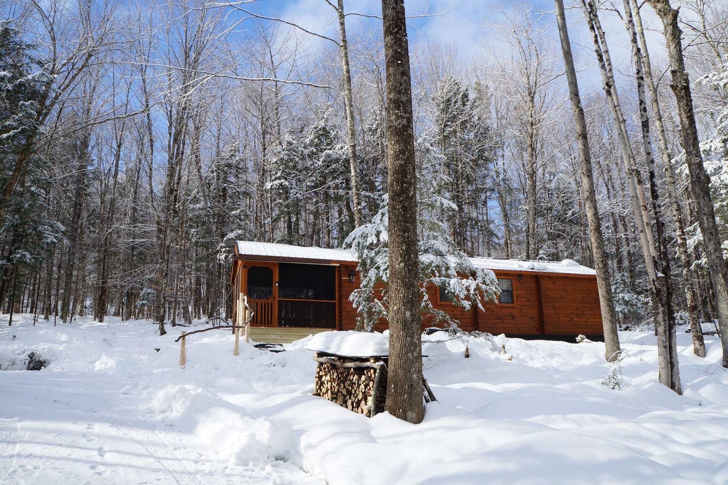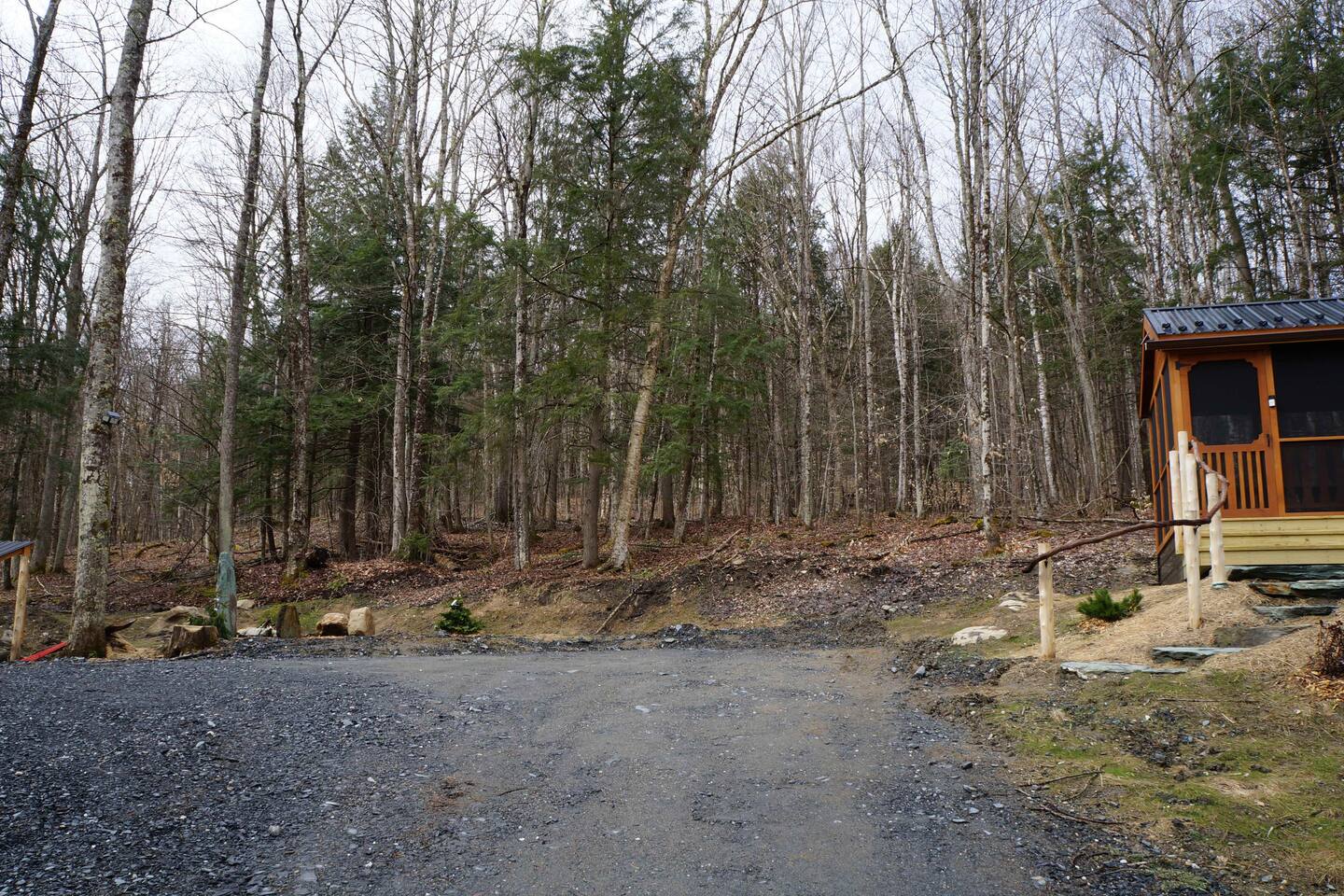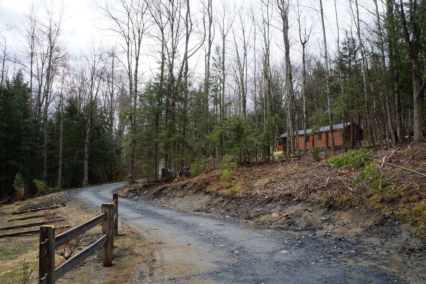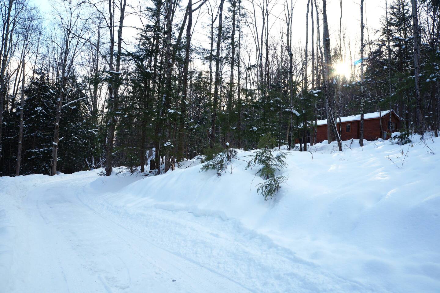The cabin is located on a private dirt road shared with neighbors. The woods create a privacy barrier between properties.