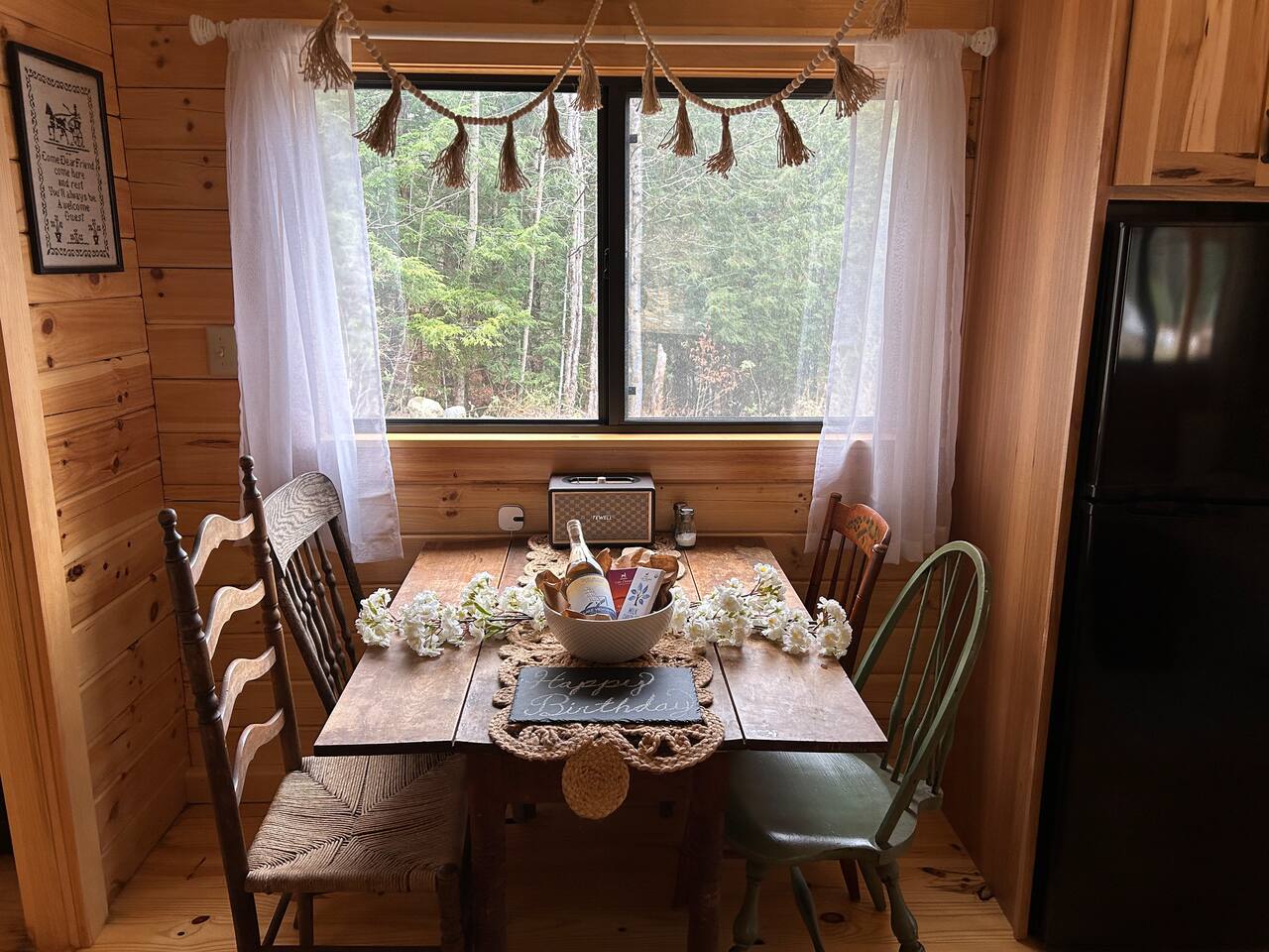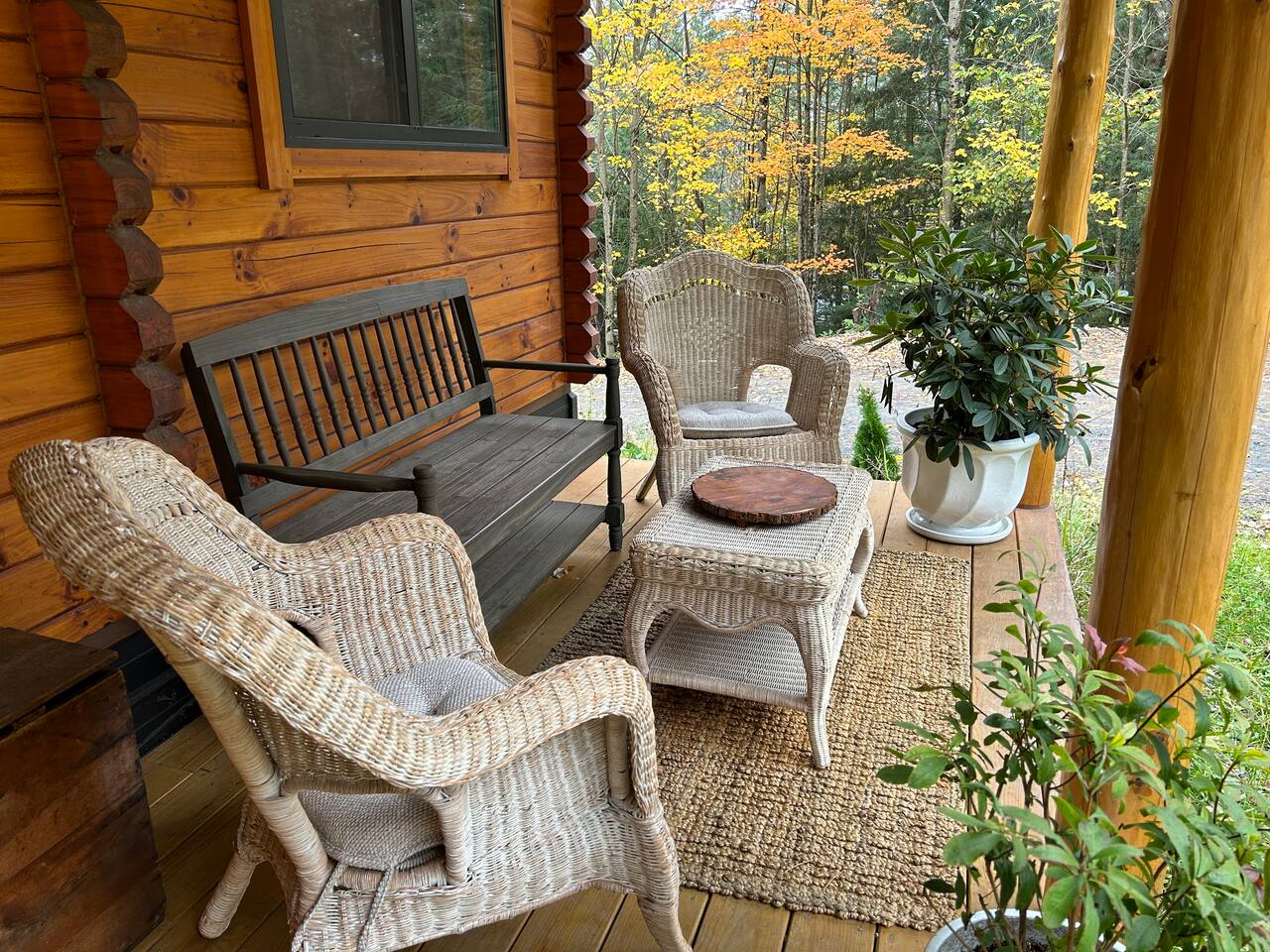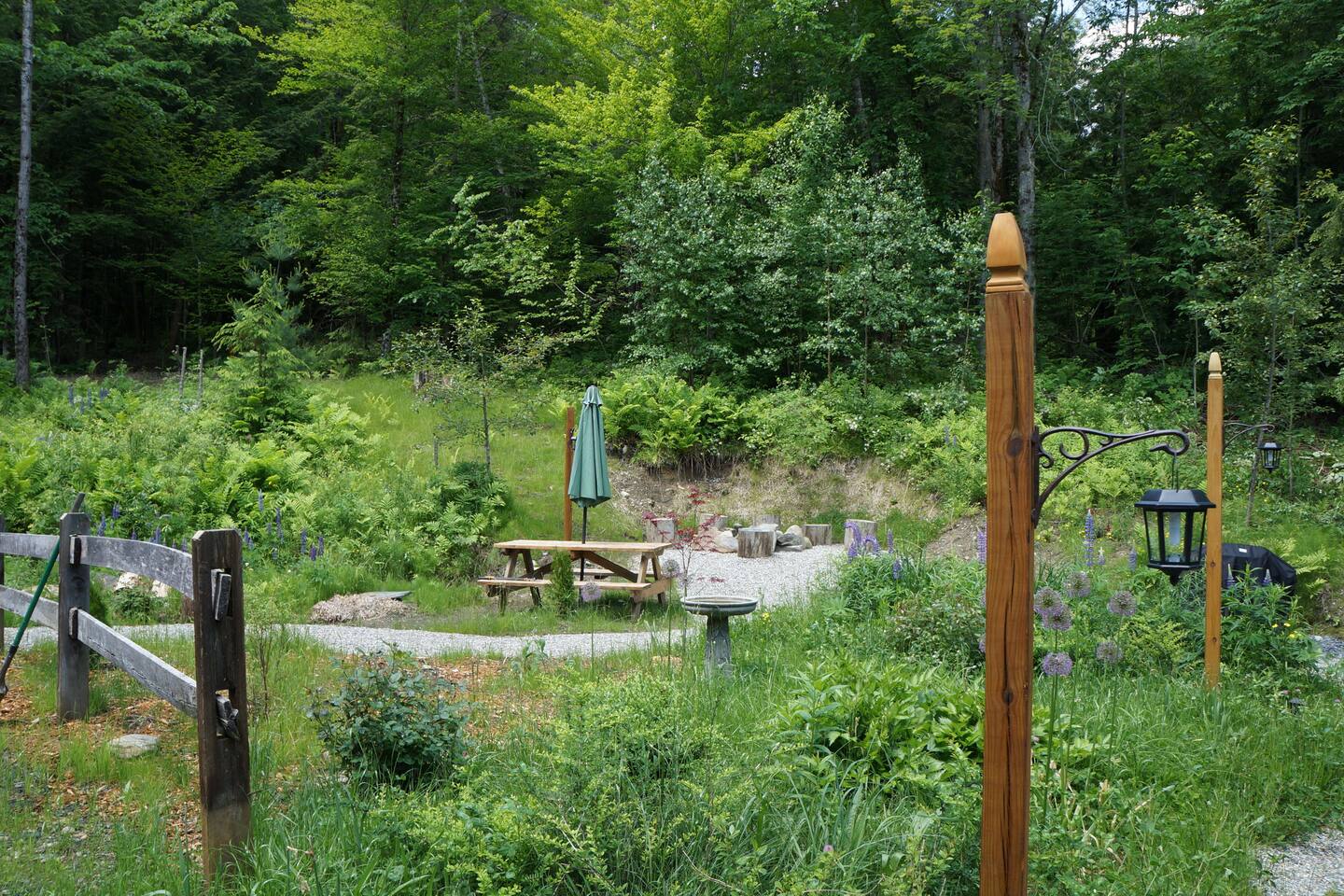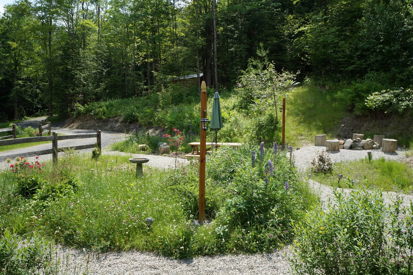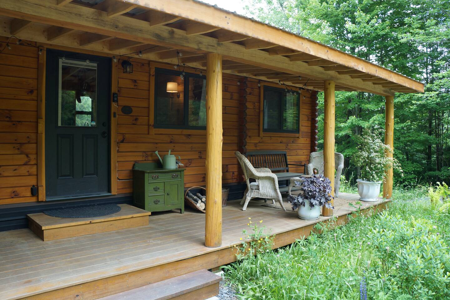 Inside the solid log cabin — built with tongue-and-groove square-cut logs — the aesthetic is light, botanical, and carefully considered. Sheer white curtains, a sage sectional sofa with botanical throw pillows, and open wooden shelving with books and ceramics fill the space. A driftwood sunburst on the wall, a freestanding electric fireplace for cold evenings, and a Roku TV with guest mode complete the living area. The main bedroom has a queen bed dressed in crisp white linens with teal botanical accent pillows, warm ceramic bedside lamps, and a gallery wall of Vermont landscape photographs and prints. A shed antler mount, a carved vintage chair, and an antique luggage rack give the room a collected, unhurried feeling. A small writing desk and chair sit in the bedroom for anyone working remotely. Above, a loft accessed by ladder sleeps two more on twin beds tucked under exposed pine beams — a sheepskin rug on the floor, a vintage trunk between the beds, and framed wildlife prints on the walls. Cozy for friends or older kids looking for their own perch. The covered porch is a destination in itself. A cast iron clawfoot soaking tub sits styled with sheer curtains and a wood side table, available seasonally when there's no risk of freezing — a genuinely one-of-a-kind Vermont experience. Step outside and the cottage garden unfolds around you: wildflowers, lupines, gravel paths, a birdbath, and a picnic area tucked into the treeline. In summer this property is extraordinary. Out front, a large fire pit is carved into the hillside with round log seating. Firestarters and a lighter are provided — firewood is available for purchase locally. A gas grill is available for most of the year. In winter, grab the two pairs of snowshoes and head into the back woods. The full kitchen features hickory cabinetry, black appliances, and a hanging pot rack — fully stocked with everything you'll need. A farmhouse dining table with vintage chairs seats four. Heat and A/C are handled by two mini-split systems. A washer and dryer, iron, and hair dryer are available. We provide 100% cotton sheets, full towels, and all bathroom and kitchen essentials. A drip coffee maker with complimentary coffee, tea, creamers, and sugar is ready and waiting. High speed Wi-Fi throughout.