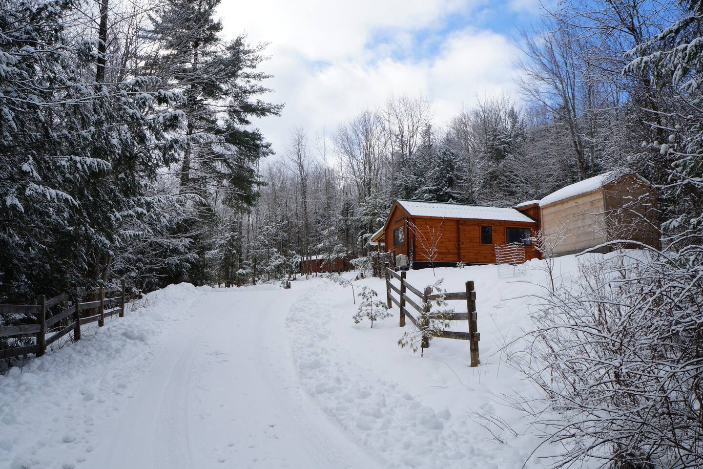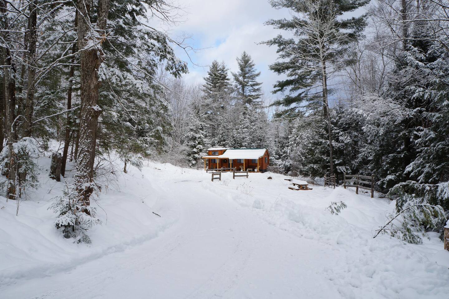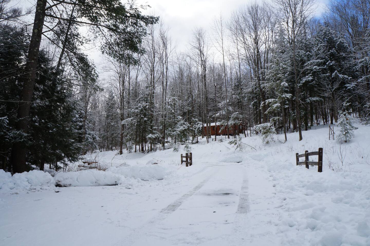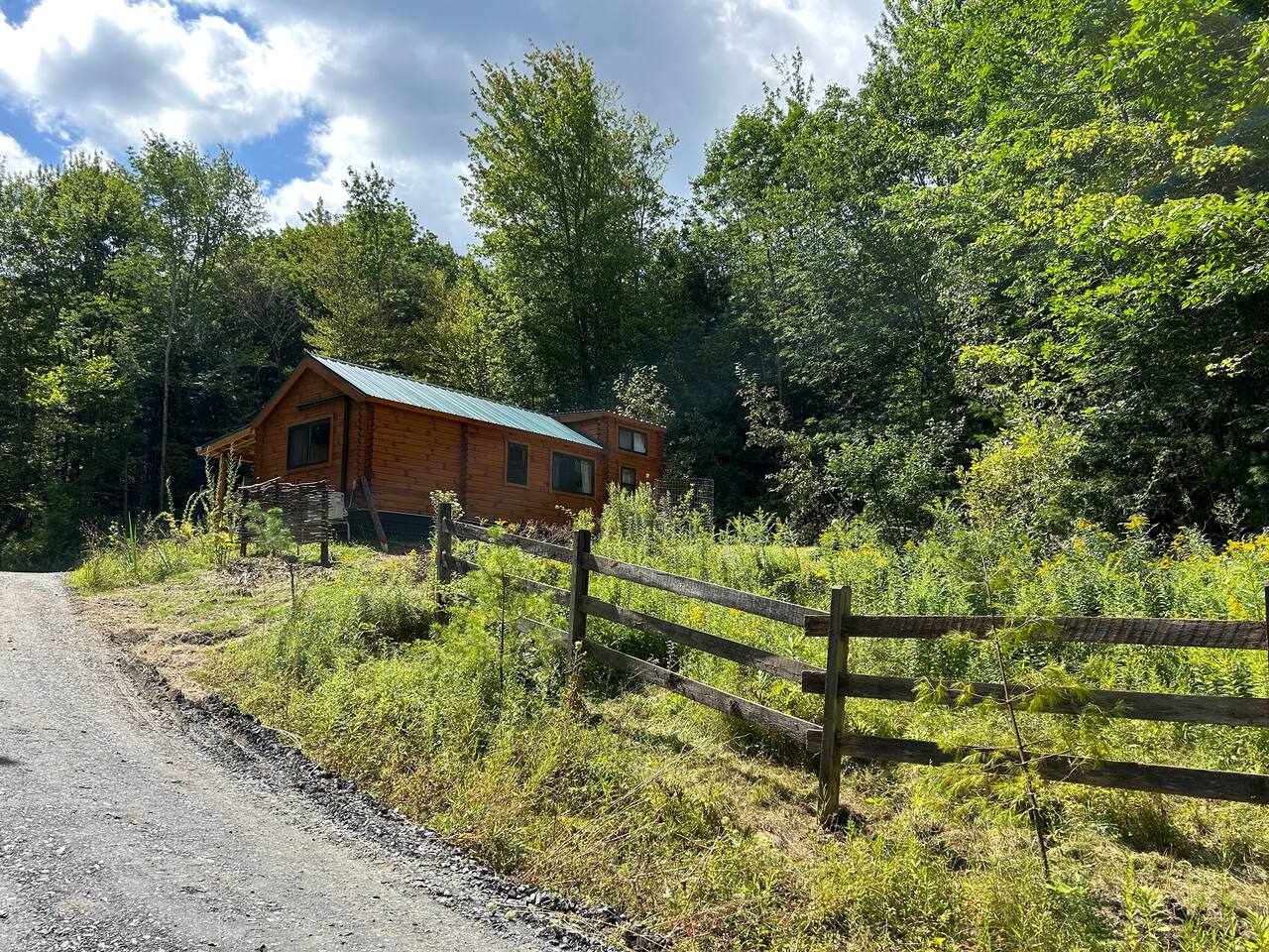 The cabin is accessed via keypad — your door code will be sent prior to arrival. A Ring doorbell is located at the front door if you need to reach us directly. The cabin and surrounding 10 wooded acres are entirely yours for your stay — feel free to roam the back woods freely. Please be aware the property is narrow, so you may wander onto neighboring land; neighbors are friendly and this is not a concern. Parking is at the cabin and accommodates two cars. Note that in winter, snowpack can make the parking area tight for two vehicles.
