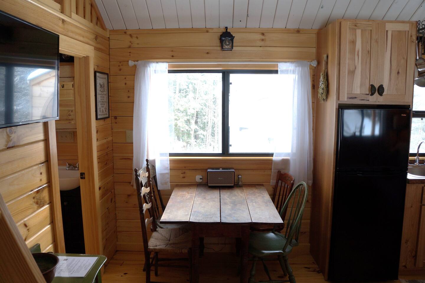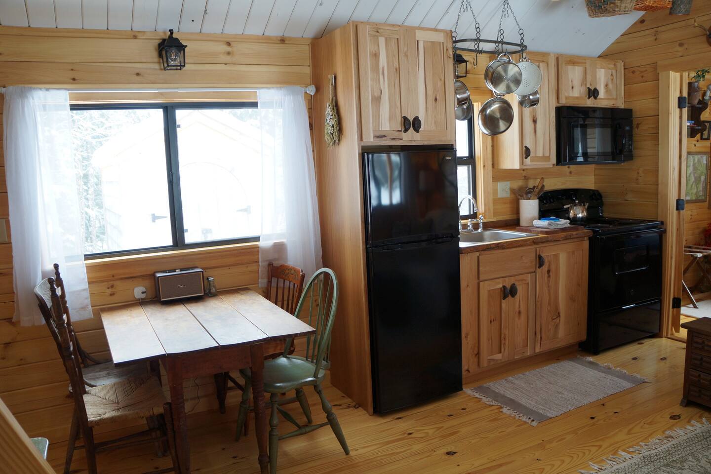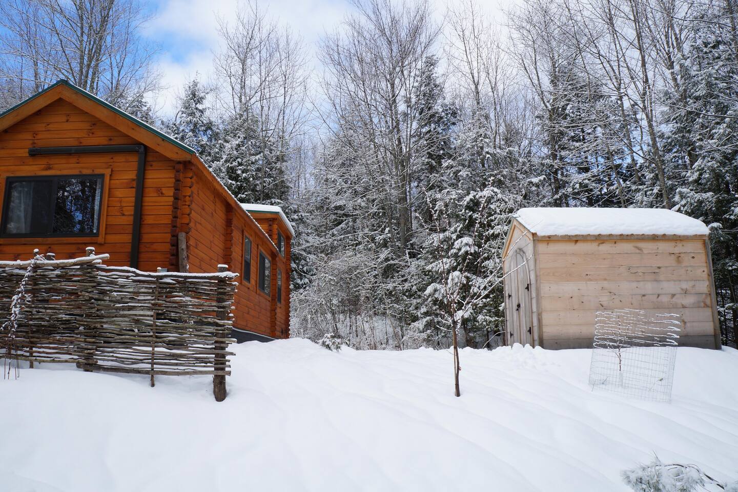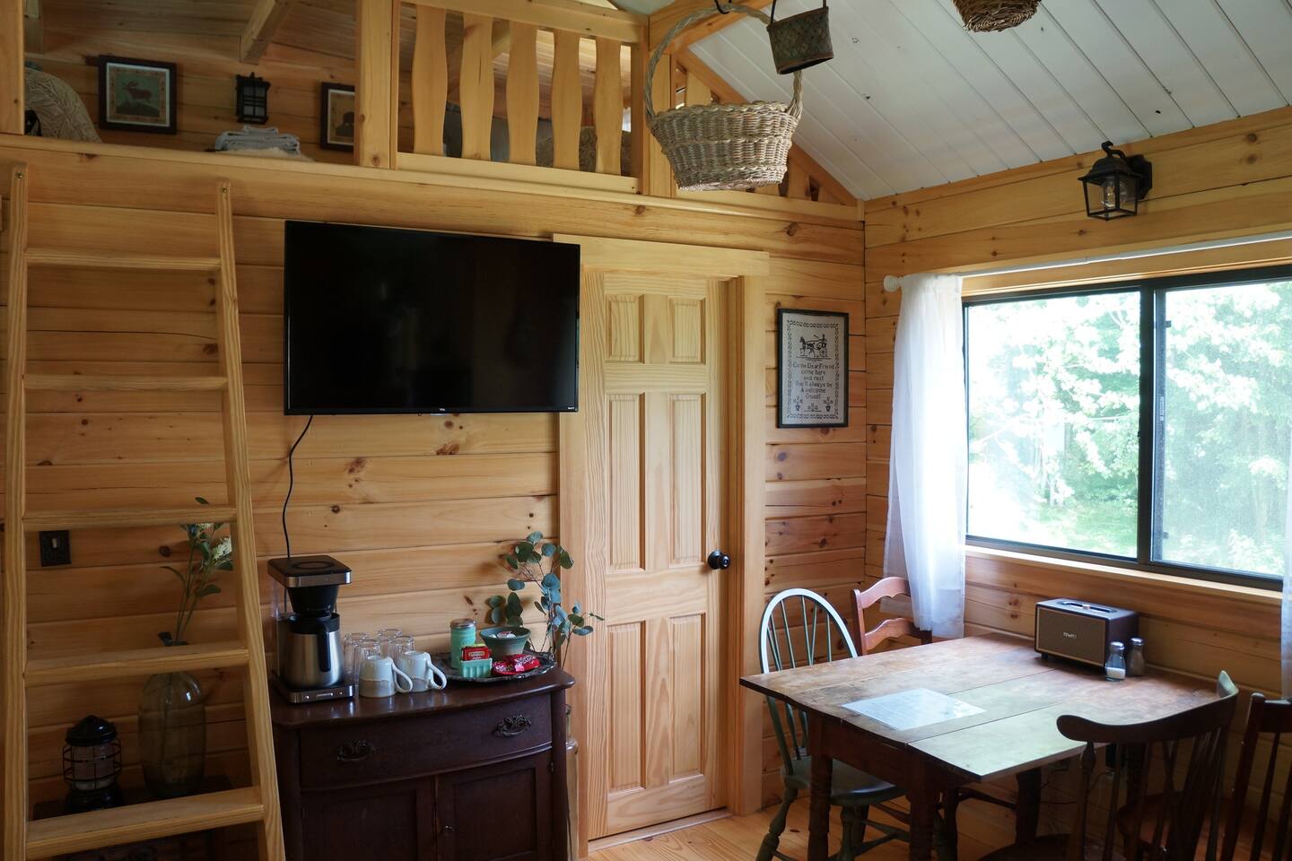 The cabin is accessed via keypad — your door code will be sent prior to arrival. A Ring doorbell is located at the front door if you need to reach us directly. The cabin and surrounding 10 wooded acres are entirely yours for your stay — feel free to roam the back woods freely. Please be aware the property is narrow, so you may wander onto neighboring land; neighbors are friendly and this is not a concern. Parking is at the cabin and accommodates two cars. Note that in winter, snowpack can make the parking area tight for two vehicles.