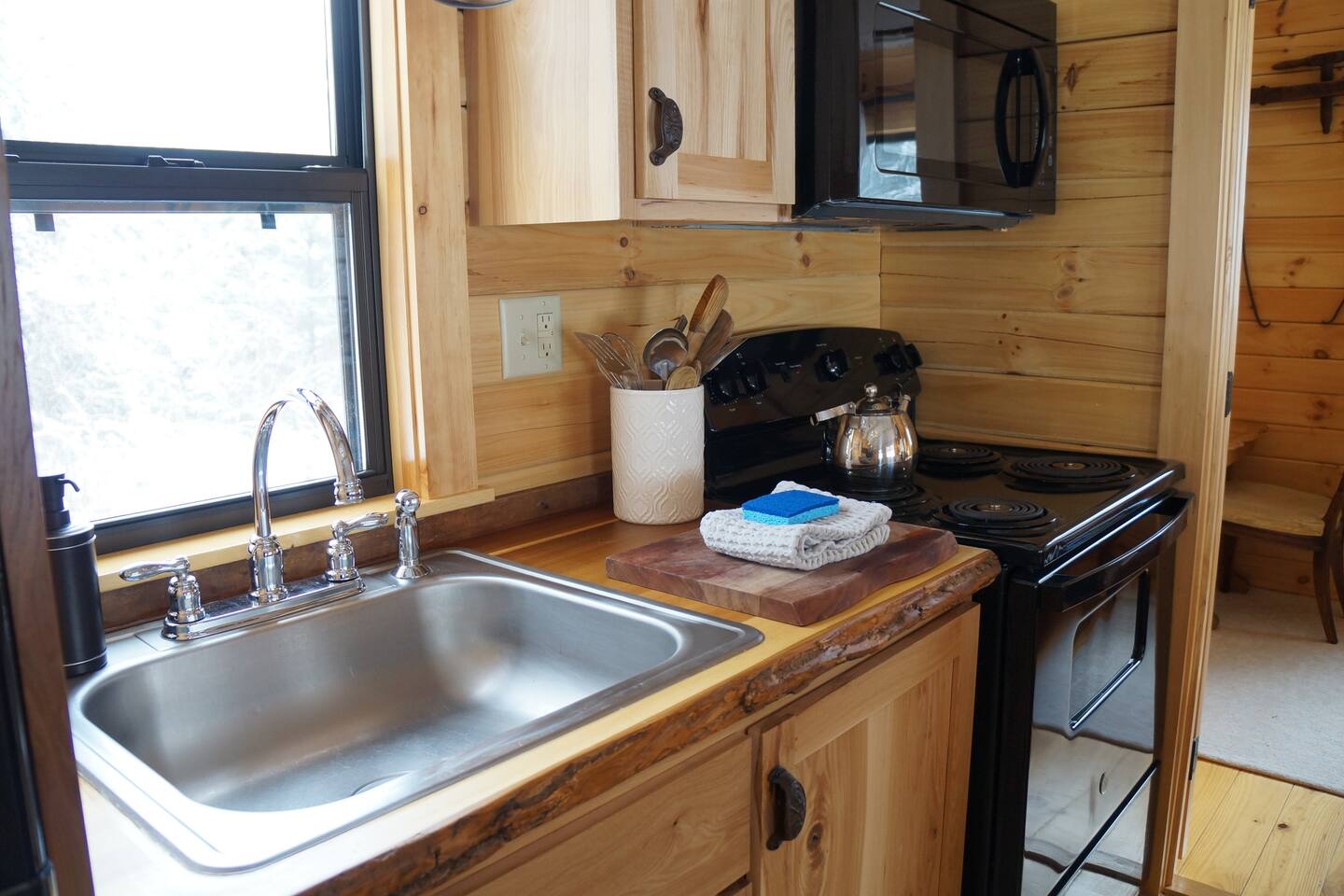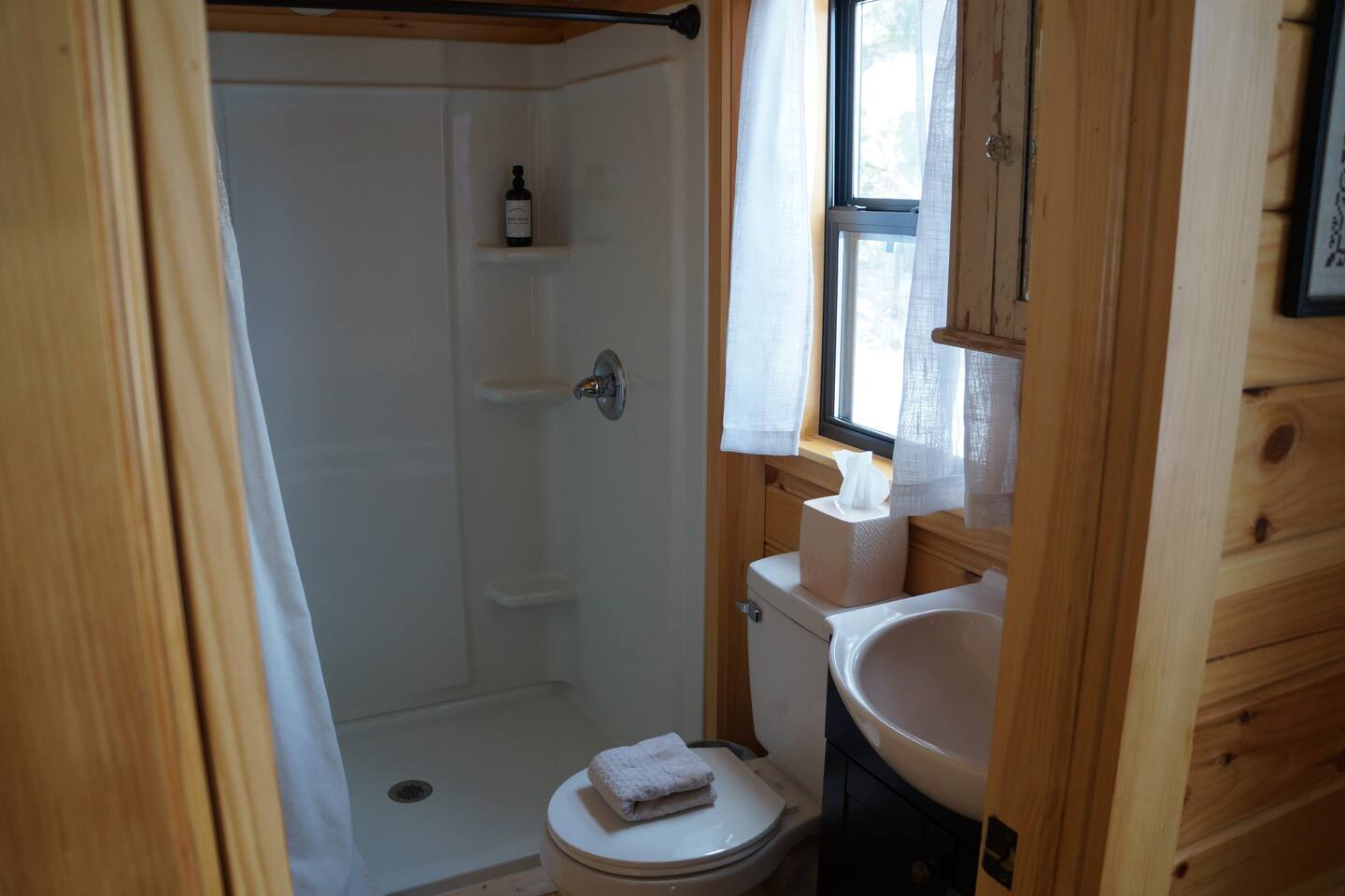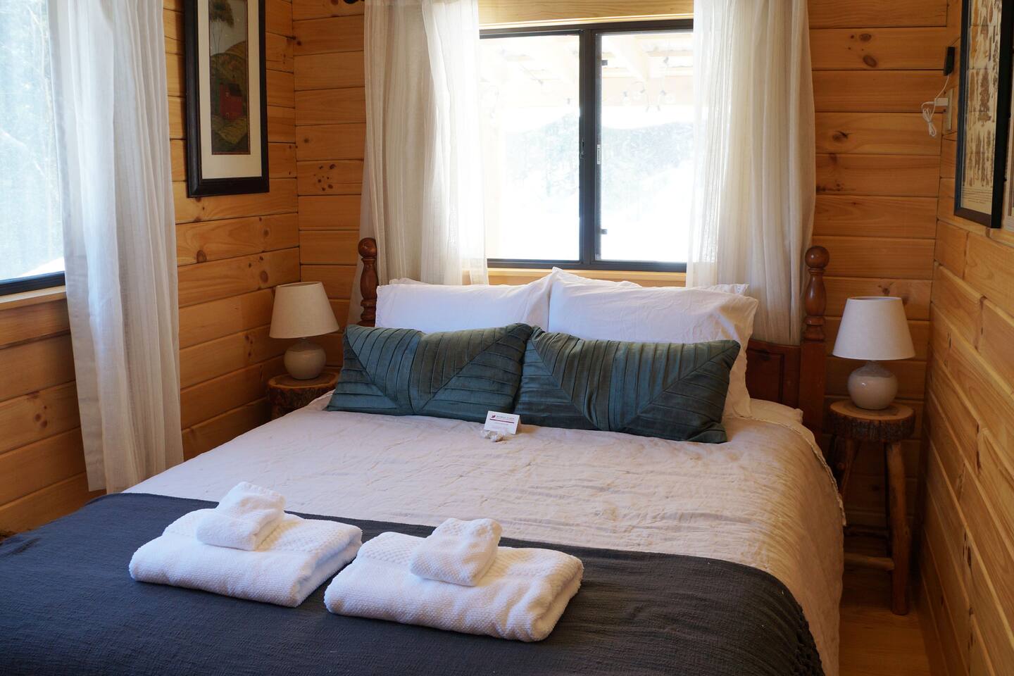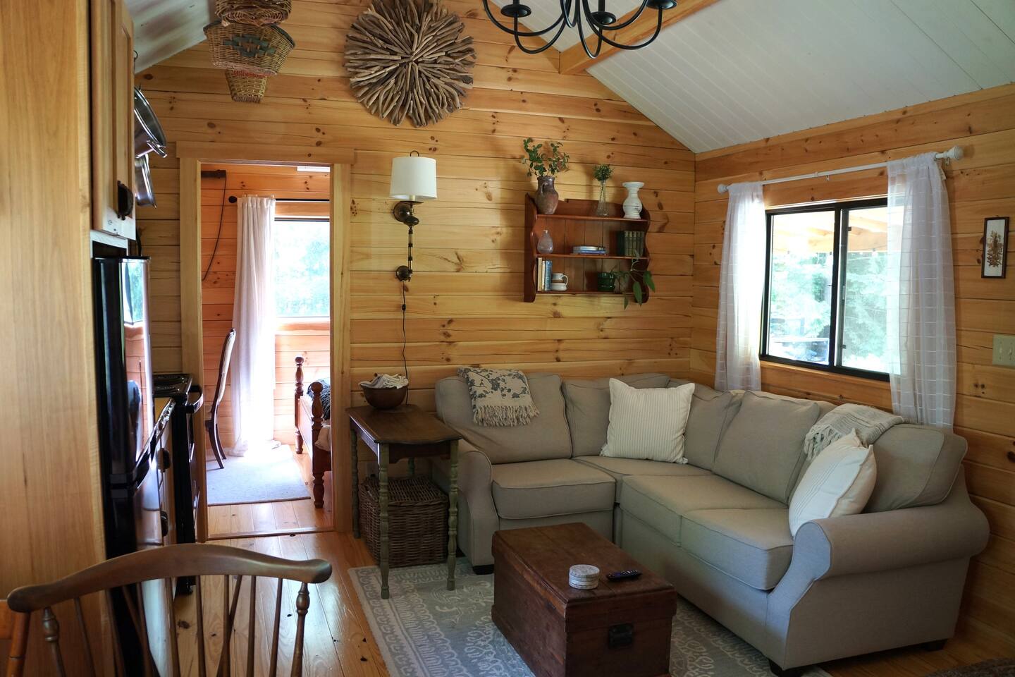 The cabin is accessed via keypad — your door code will be sent prior to arrival. A Ring doorbell is located at the front door if you need to reach us directly. The cabin and surrounding 10 wooded acres are entirely yours for your stay — feel free to roam the back woods freely. Please be aware the property is narrow, so you may wander onto neighboring land; neighbors are friendly and this is not a concern. Parking is at the cabin and accommodates two cars. Note that in winter, snowpack can make the parking area tight for two vehicles.