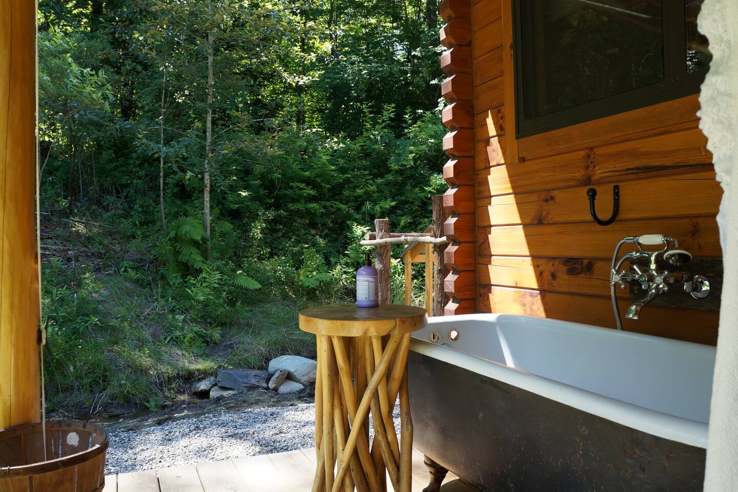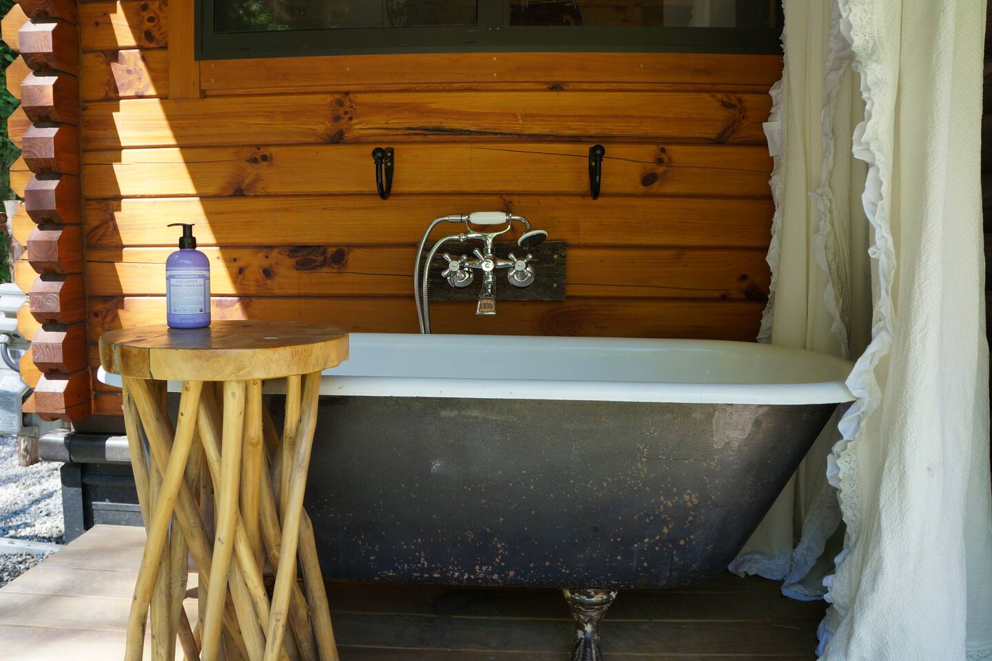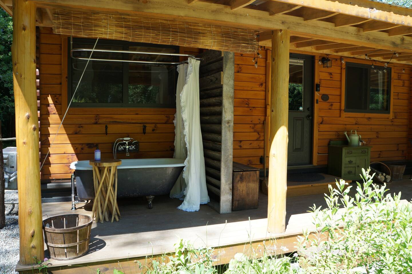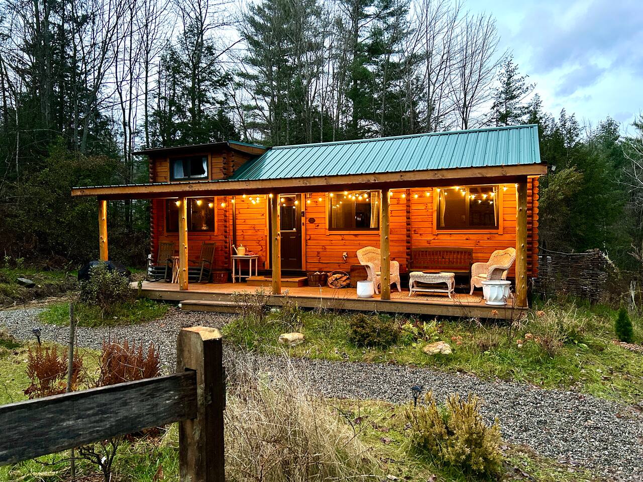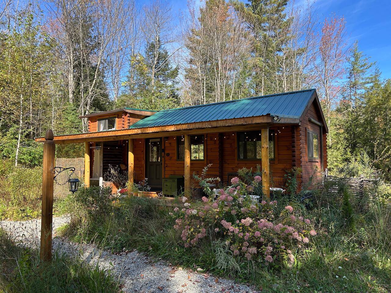 Escape to a rustic log cabin with the soul of an English cottage, tucked into 10 wooded acres of Vermont countryside. A four-guest hideaway with a cottage garden, a cast iron clawfoot soaking tub on the covered porch, a fire pit carved into the hillside, snowshoes for winter wandering, and all the comforts of home in a setting that feels like it belongs to another century. 22 minutes from Sugarbush, 20 from Mad River Glen, 39 from Stowe.